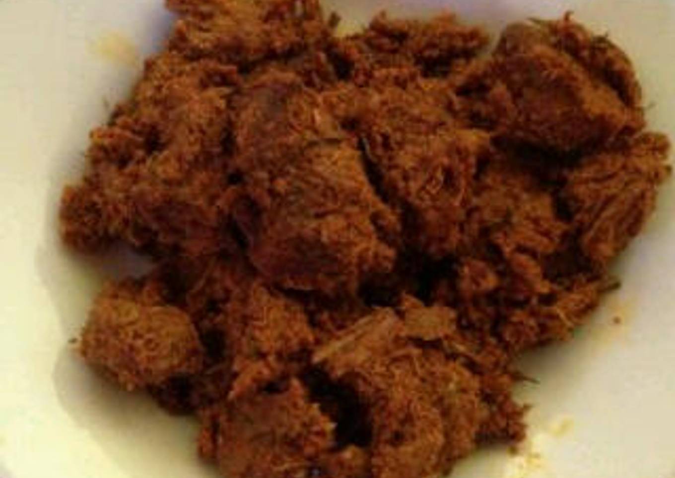 - Masukkan santan kental, air kelapa, air, masak sambil diaduk hingga daging empuk dan kuah kering. Masaknya jangan dengan api besar