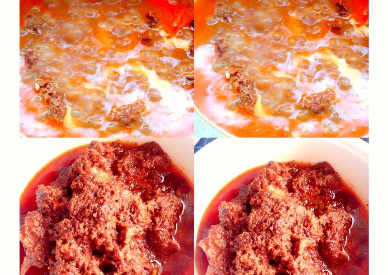 - Masukkan daging kedalam tumisan bumbu, aduk rata tunggu sampai bumbu meresap lalu masukkan air kaldu yg tadi dan juga santan, tambahkan garam secukupnya dan koreksi rasa, aduk terus sampai kuahnya menjadi kering. Siap disajikan.